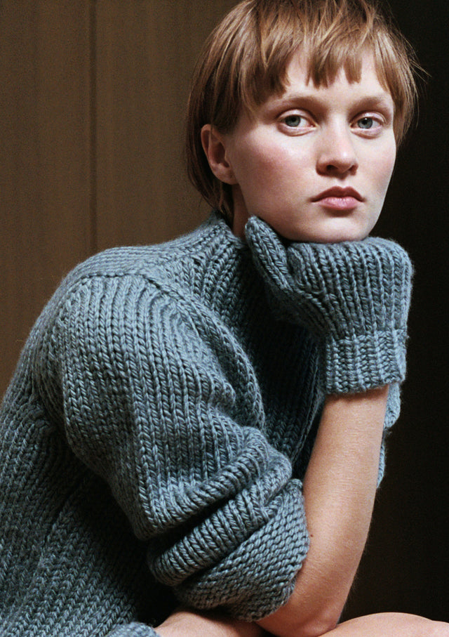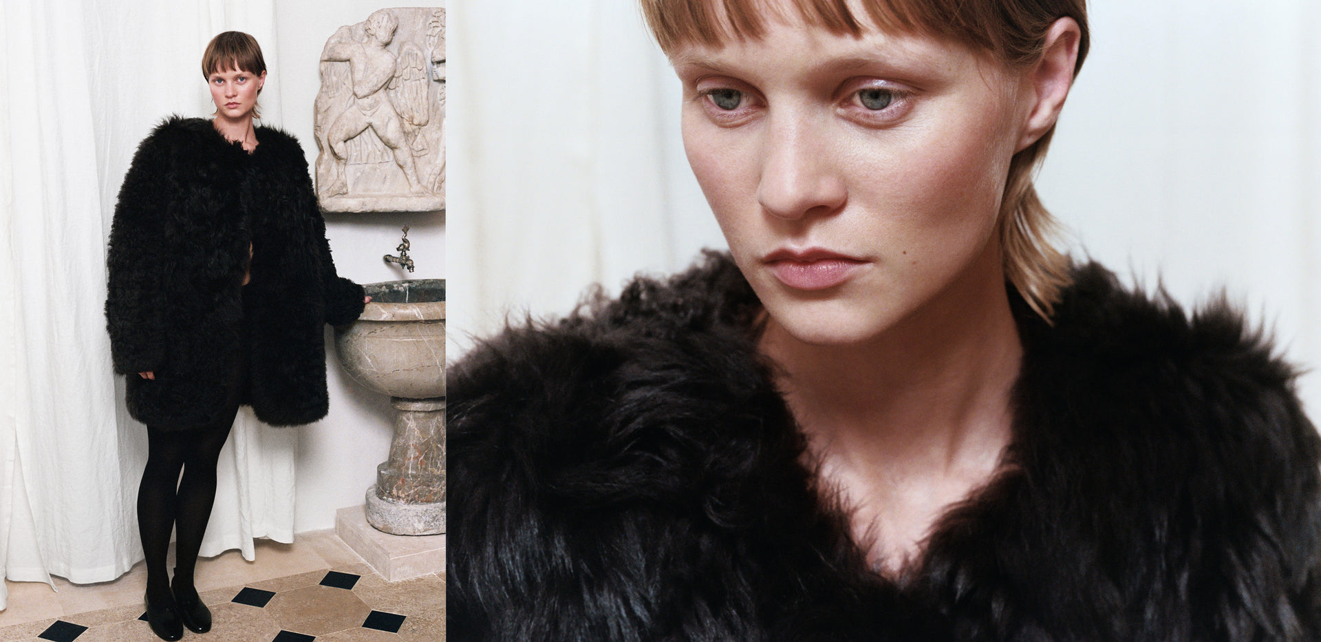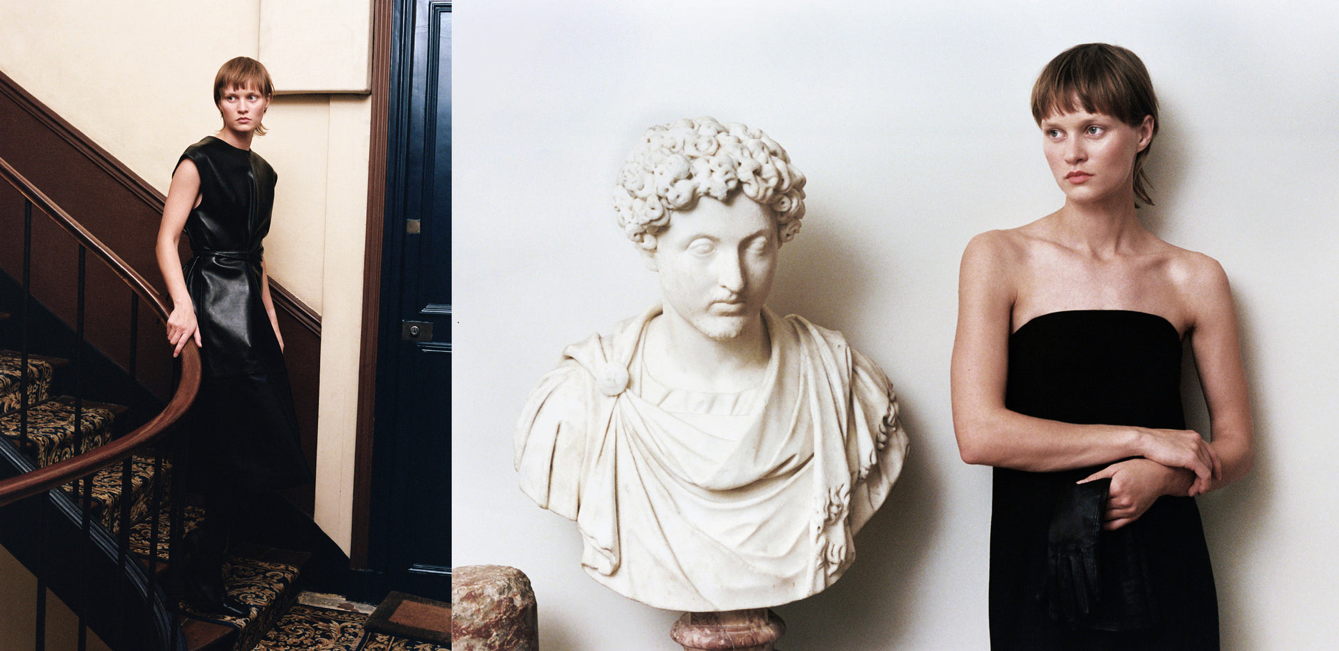Un traje oversize tomado del armario masculino se combina con un vestido bustier de lana de líneas depuradas. La piel de lana abriga el cuerpo, los cueros brillan en un verde oliva intenso o en negro lacado. El punto fino se desliza suavemente sobre la piel. Los zapatos de tacón Théa en color marfil, el bolso Suzanna en charol y el pañuelo de seda plisado completan este look sofisticado y sobrio.