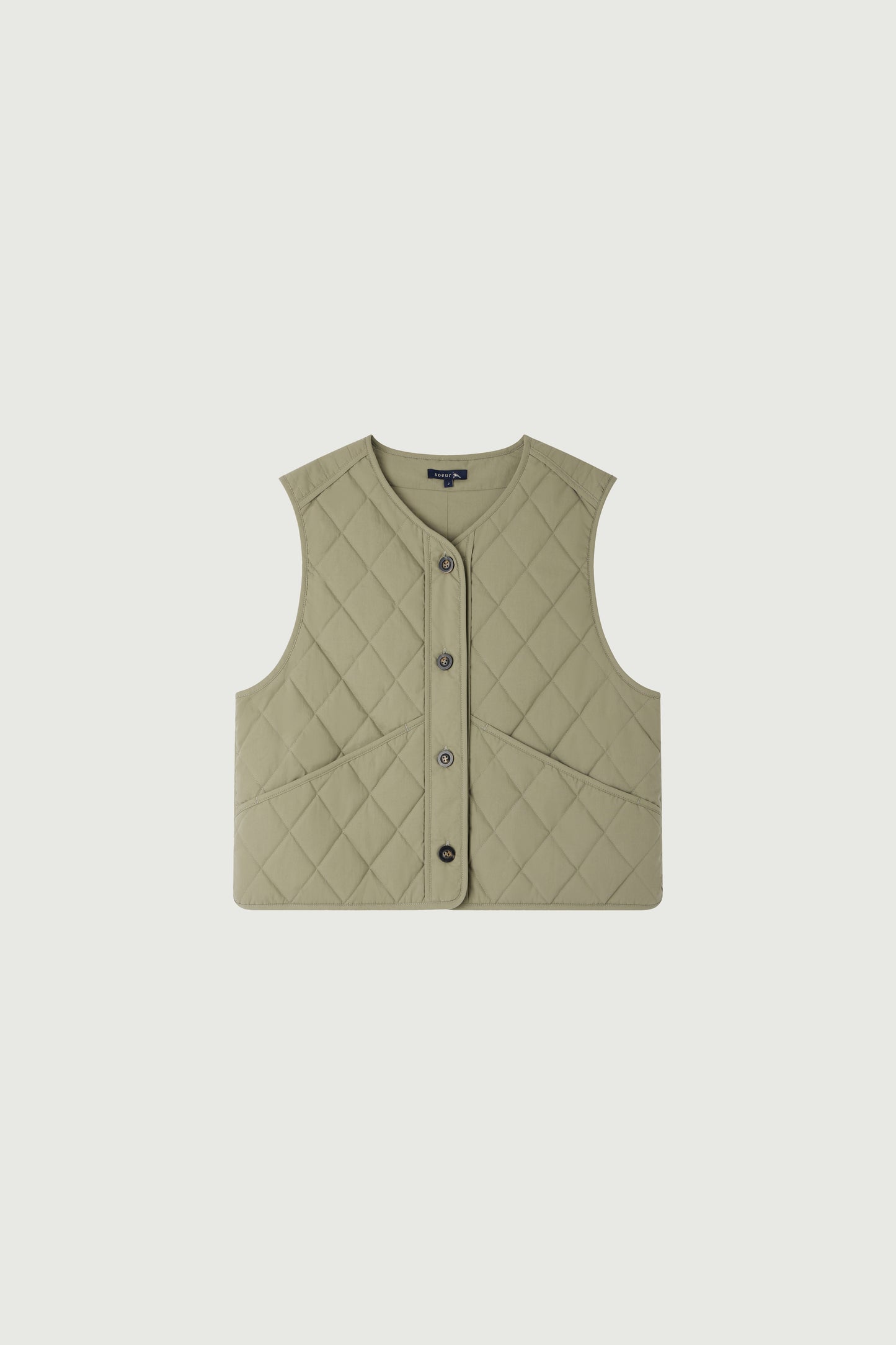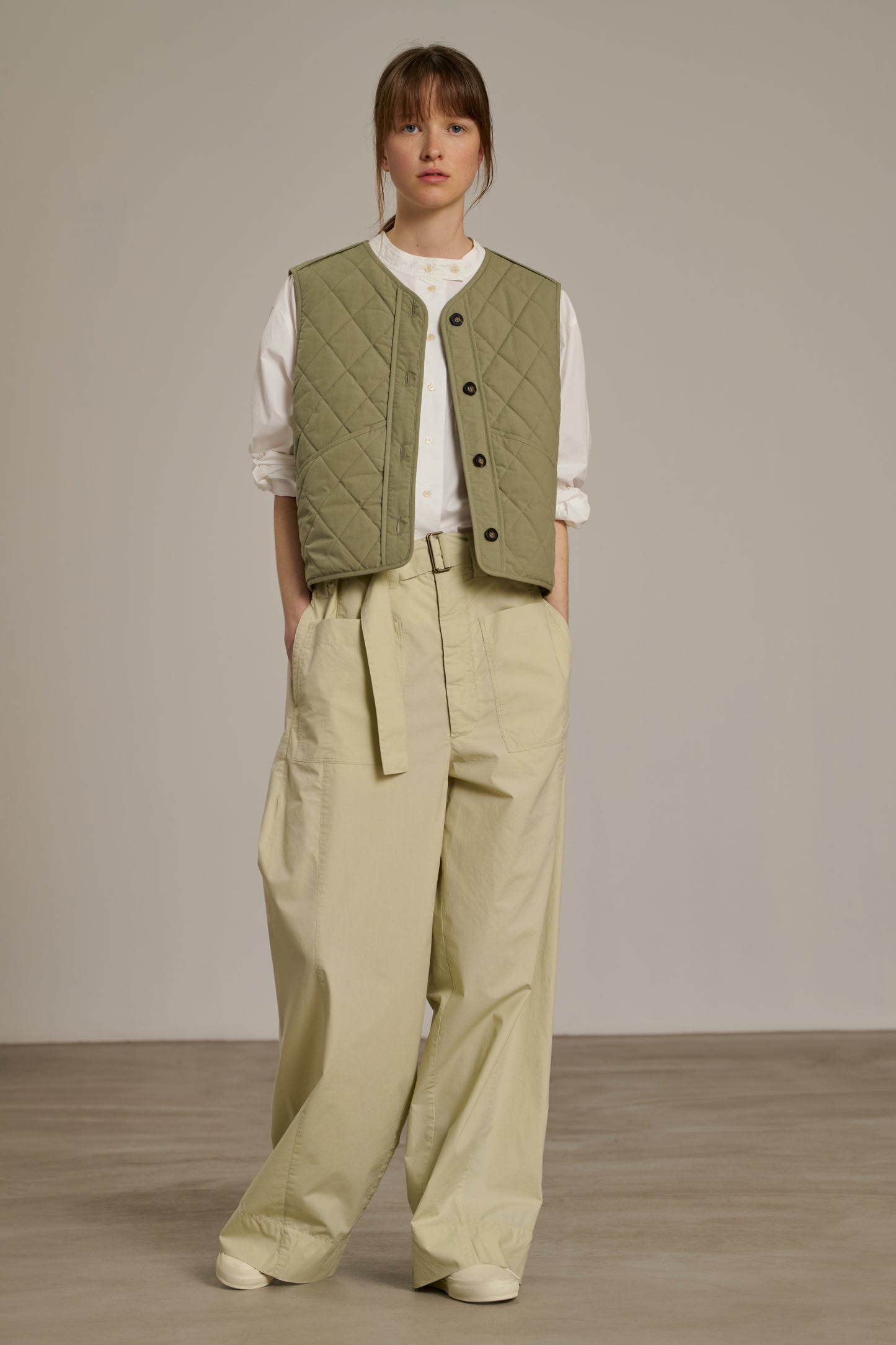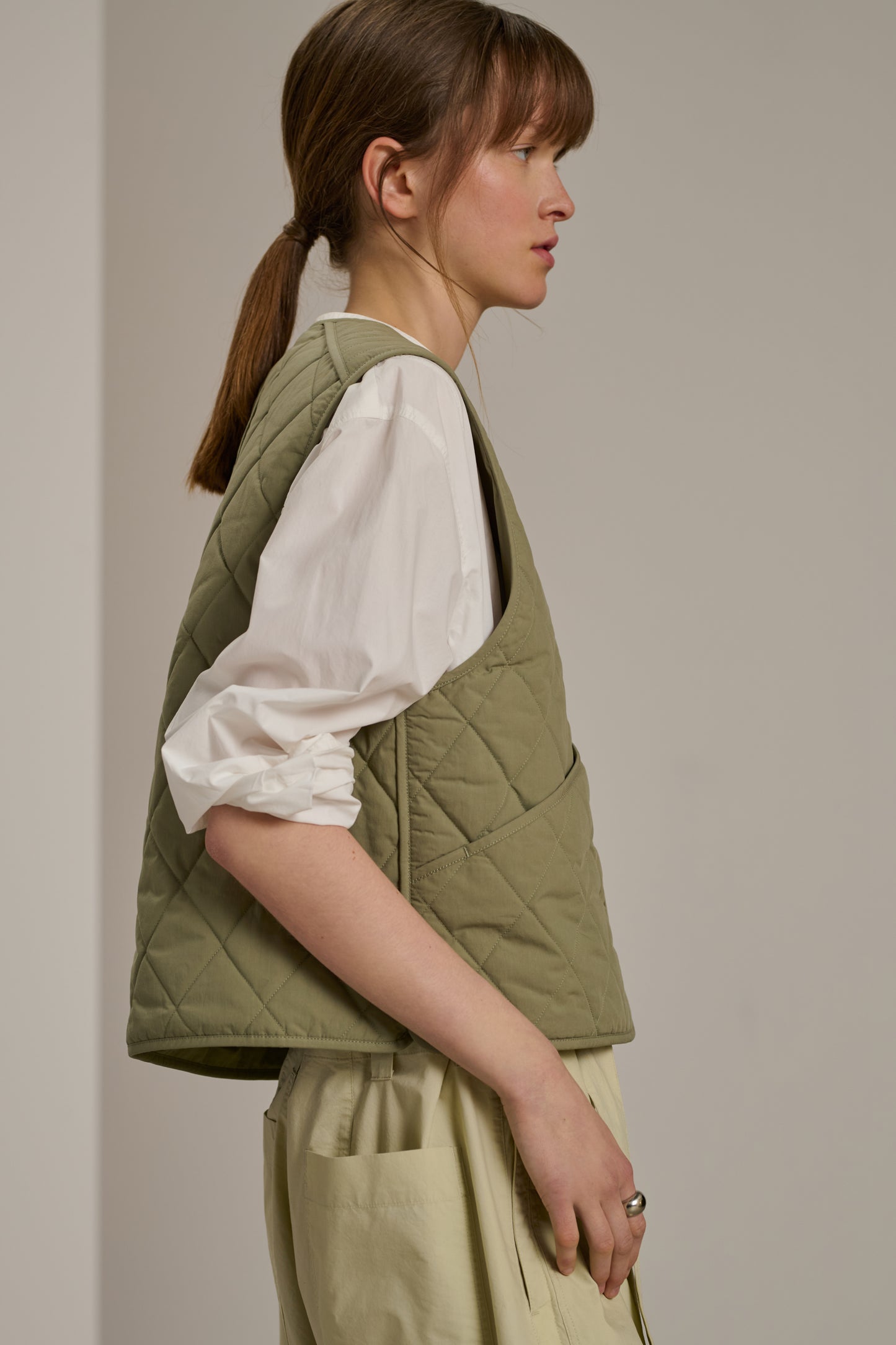 ULLA es un chaleco acolchado de algodón que puedes combinar como quieras. Tiene un ligero relleno, pero es lo suficientemente delgado como para llevarlo debajo de un abrigo sin restringir el movimiento. Los acabados con ribete destacan los hombros, los bolsillos de parche, y la tira de botones.