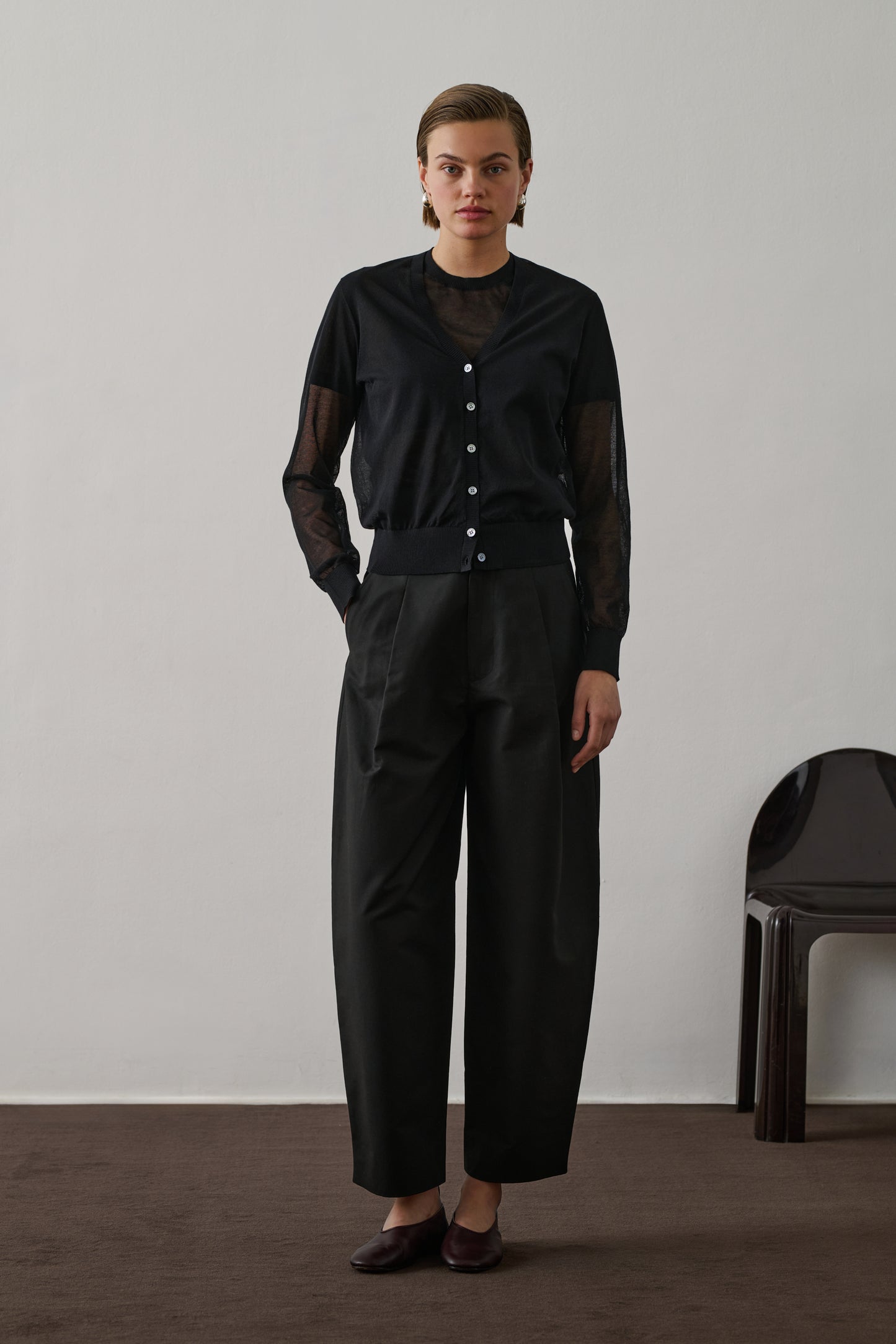 ETRETAT es un cárdigan tejido en punto ultrafino. Transparente, se puede llevar sobre la piel o superpuesto con un top elegante o informal, según el look deseado.
