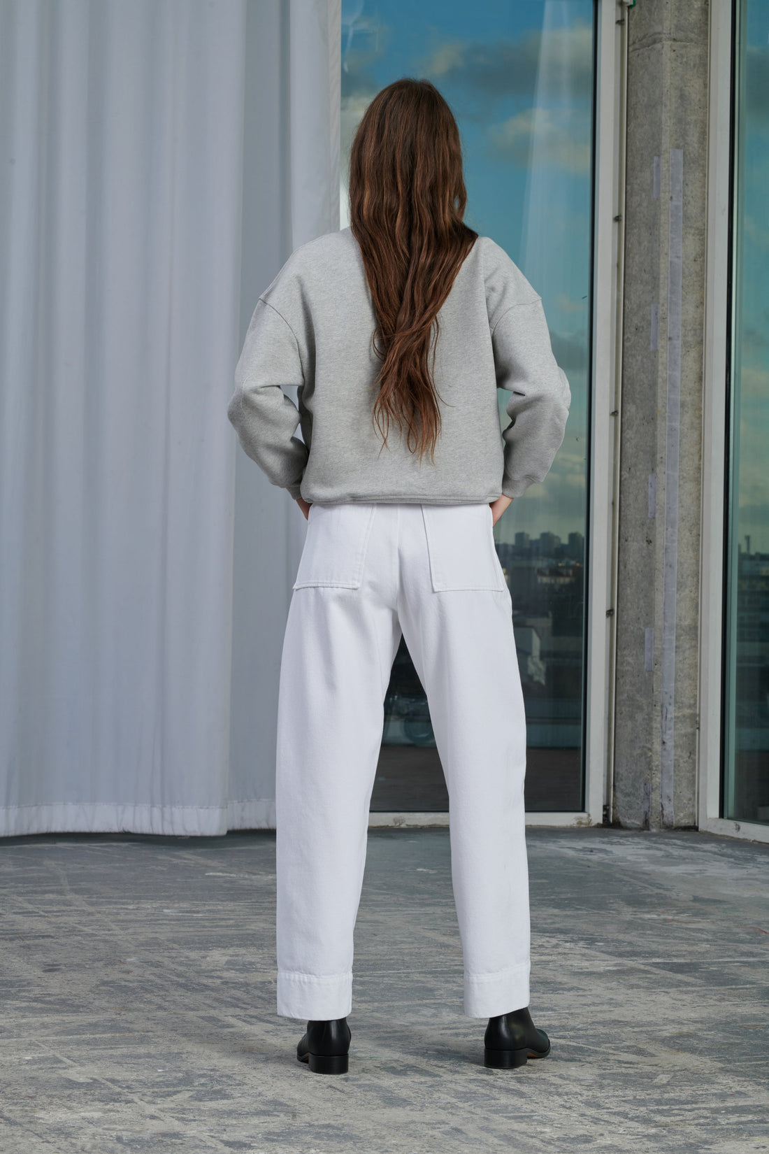 Pantalón de cintura alta con cinturón de tejido vaquero blanco - Corte ligeramente redondeado- Cinturón desmontable con doble hebilla- Dos bolsillos traseros de parche- Cierre con corchete en el interior del cinturón