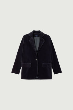 CELESTIN es un pantalón de terciopelo liso gris antracita con reflejos gris azul. Cintura alta, piernas acampanadas, con bolsillos delanteros y traseros.