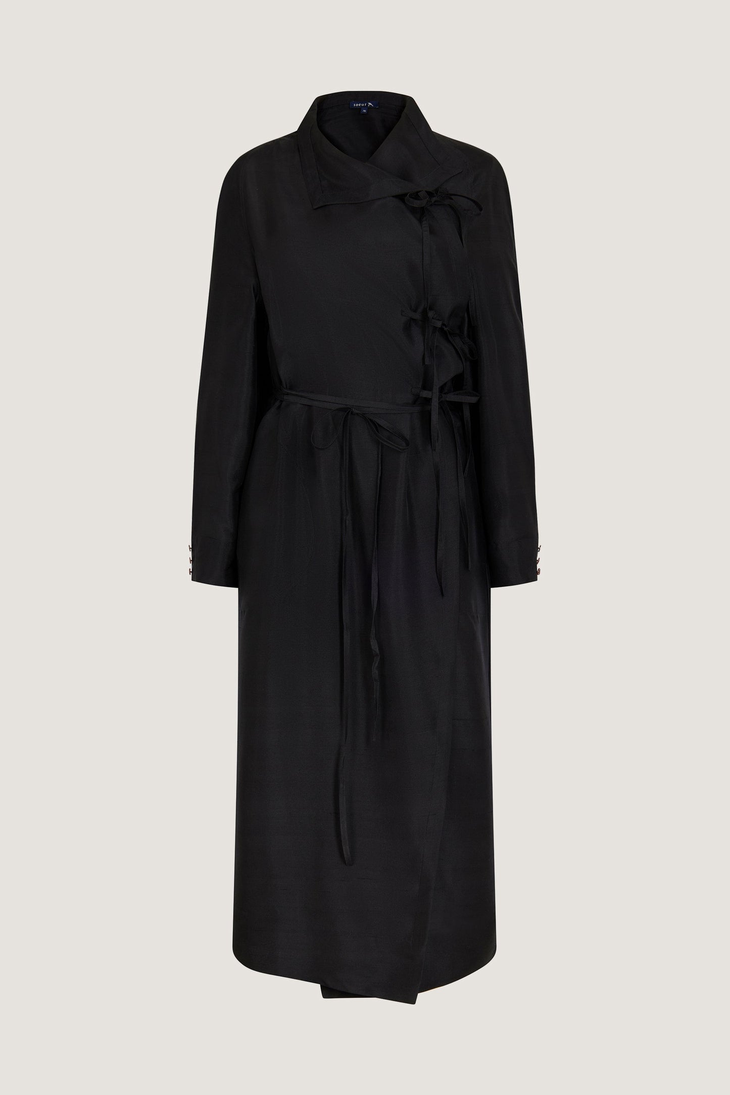 SUSIE es un vestido con aspecto de alta costura y construcción refinada. Es un vestido envolvente que se cierra hasta el cuello con lazos en la cintura y el busto. El volumen recto puede ajustarse, anudándose y adaptándose al cuerpo según convenga.